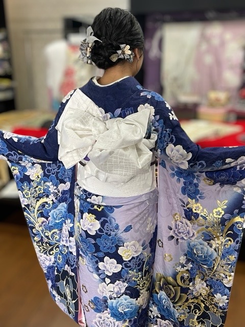 綺麗な青系の振袖に身を包み