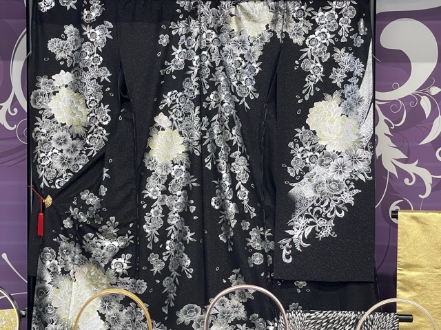 人気の黒銀の振袖は入り口真正面に